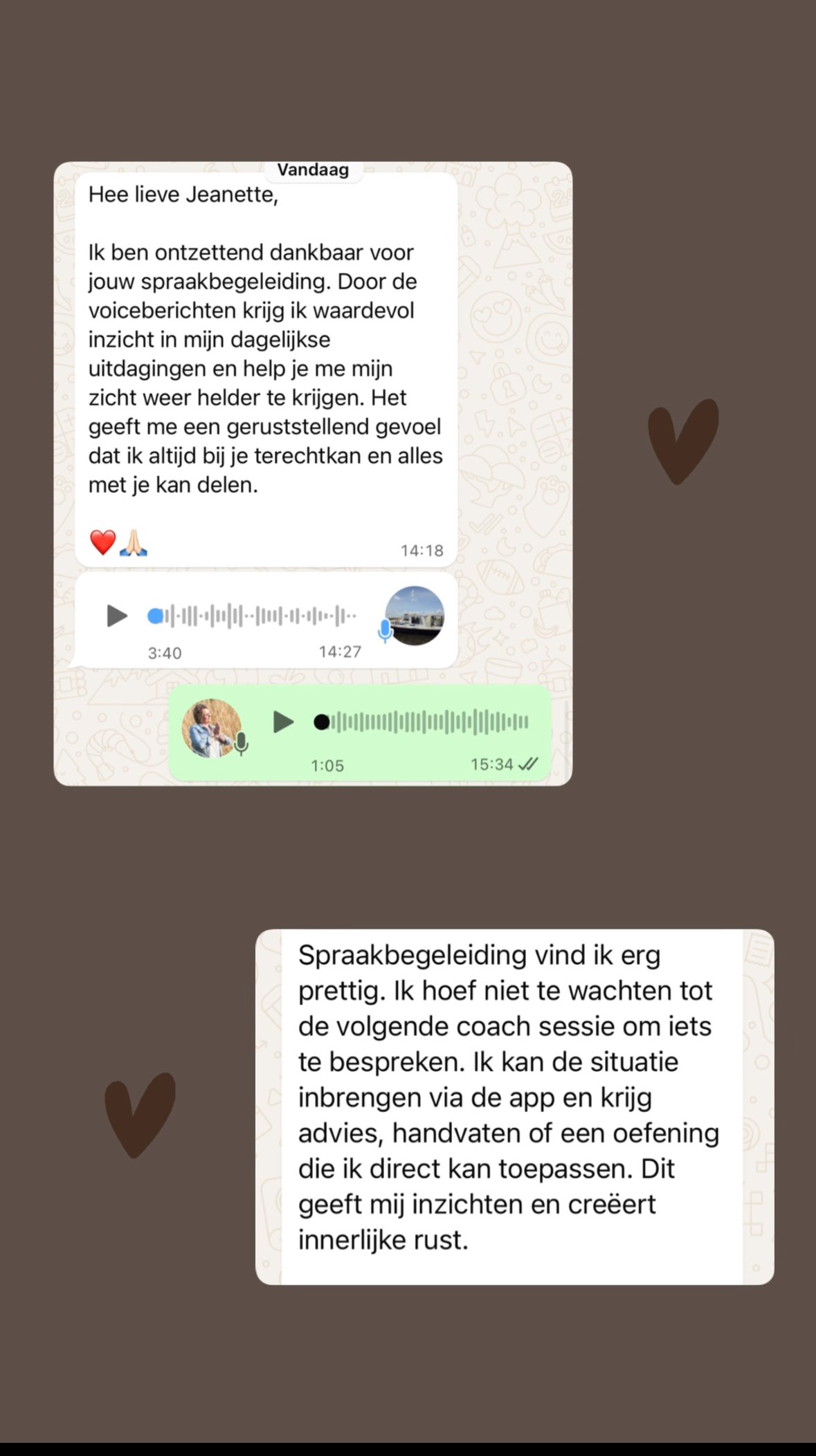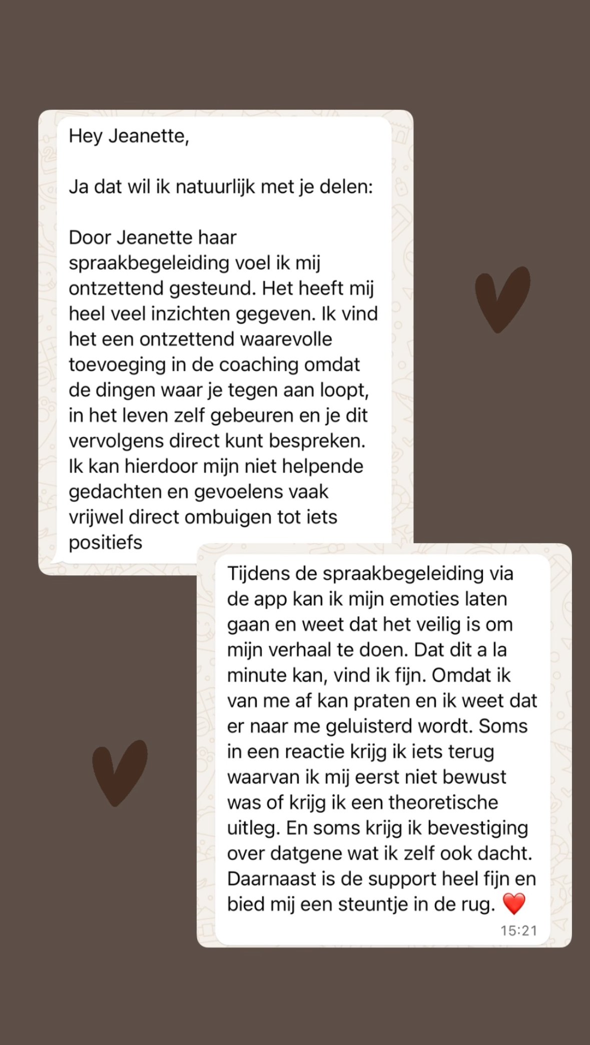 “Door Jeanette haar spraakbegeleiding voel ik me ontzettend gesteund. Het heeft me veel inzichten gegeven en ik ervaar het als een waardevolle toevoeging naast de coaching.