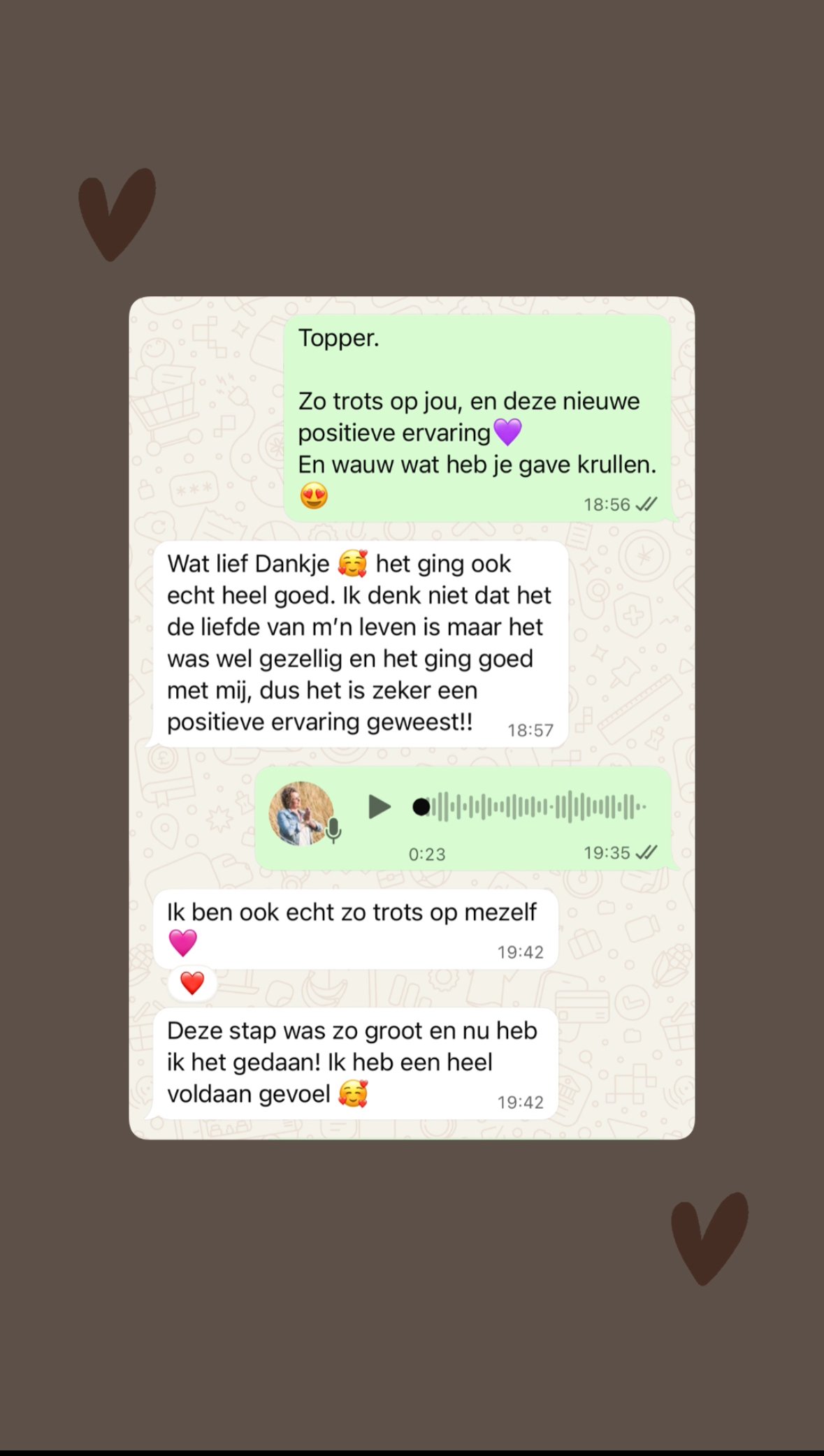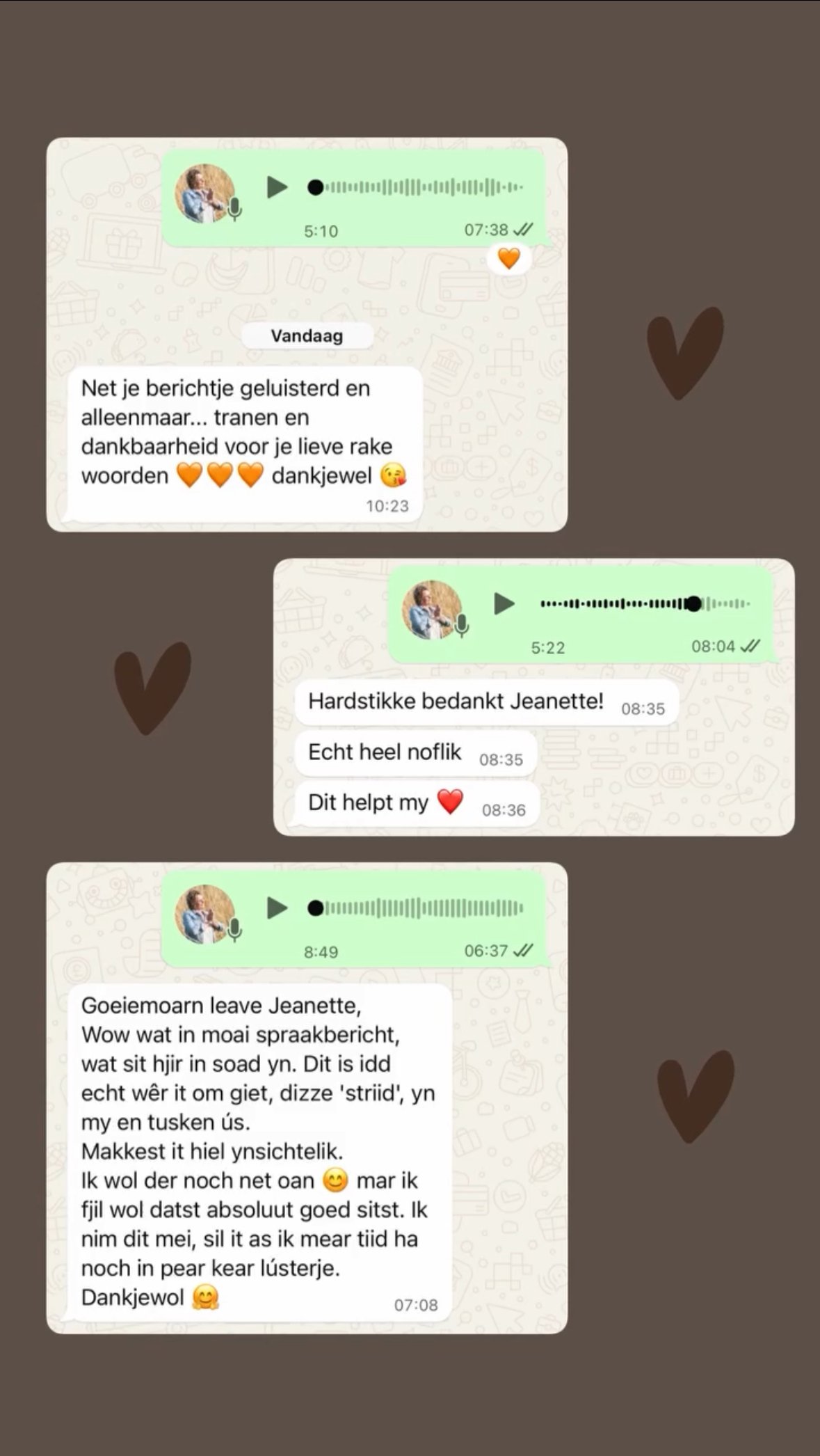 “Ik vond het in het begin spannend om begeleiding te zoeken, maar bij Jeanette voelde ik me meteen op mijn gemak. Ze gaf me de ruimte om te zeggen wat ik anders nooit hardop zou uitspreken. Het heeft me geholpen om niet alleen mijn partner beter te begrijpen, maar ook mezelf. Ik merk dat ik rustiger reageer in situaties die me vroeger volledig uit balans brachten. Dat is niet alleen fijn voor onze relatie, maar ook voor mijzelf.”